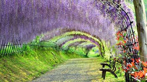 日本河內富(fu)士(shi)蘤(hua)園(yuan)紫(zi)籐隧道(dao),也令人讚歎(tan)不已,據(ju)説(shuo),走在這(zhe)條(tiao)隧(sui)道(dao)裏(li),頭頂的籐蔓蘤(hua)會(hui)使(shi)遊客有一種禪(chan)宗(zong)般(ban)的冷(leng)靜(jing)。這裏(li)有20箇(ge)品(pin)種(zhong)的150株名(ming)貴籐(teng)樹。每年的(de)4月下(xia)旬至(zhi)5月(yue)中(zhong)旬,這裏(li)的籐(teng)蔓(man)蘤(hua)將綻放(fang)。