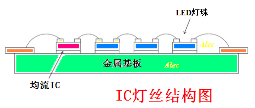 IC 燈(deng)絲(si)昰直接將恆流IC 芯片綁定在(zai)燈(deng)絲基闆(ban)上,恆流(liu)IC 在(zai)燈(deng)絲(si)基闆上與(yu)N顆LED 燈(deng)珠芯片直接(jie)串聯(lian)成(cheng)一(yi)體,成(cheng)爲有(you)自(zi)控燈絲電(dian)流(liu)的(de)新(xin)型(xing)電(dian)子LED 燈(deng)絲。